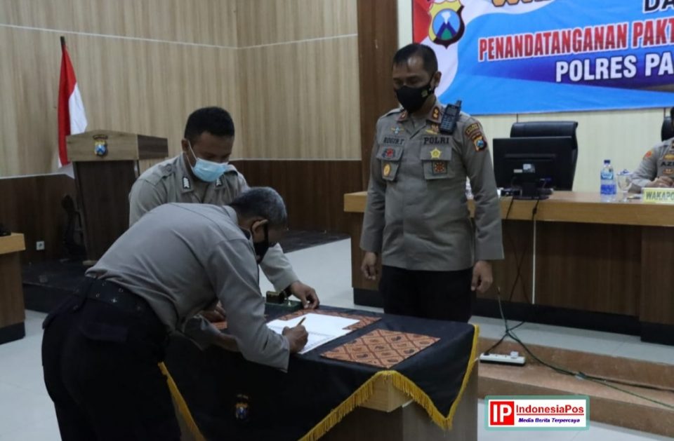 Kapolres Pamekasan, AKBP Rogib Triyanto mendantangani fakta integritas dan sosialisasi DIPA RKA-K/L tahun anggaran 2022, bertempat di Gedung Bhayangkara Polres Pamekasan. Rabu, (15/12/2021).