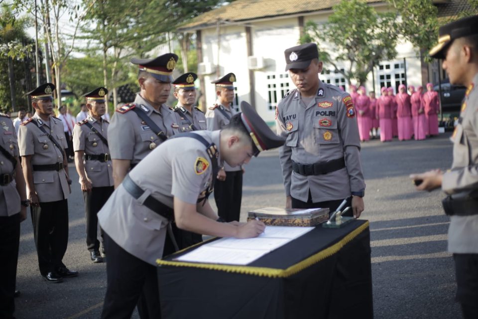 Kapolres Sampang AKBP Siswantoro memimpin upacara serah terima jabatan (Sertijab) Pejabat Utama (PJU) dan Kapolsek jajaran, di halaman apel Wira Manunggal Wicaksana Mapolres Sampang. Senin (09/10/2023)
