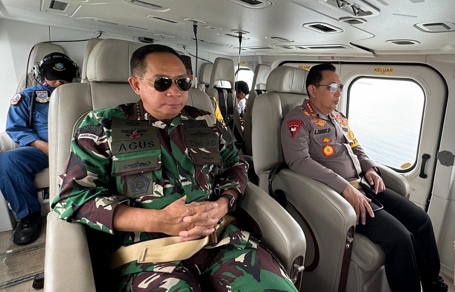Kapolri Jenderal Listyo Sigit Prabowo dan Panglima TNI Jenderal Agus Subiyanto melakukan patroli udara menggunakan helikopter menuju Pelabuhan Gilimanuk, Kamis (4/4/2024).