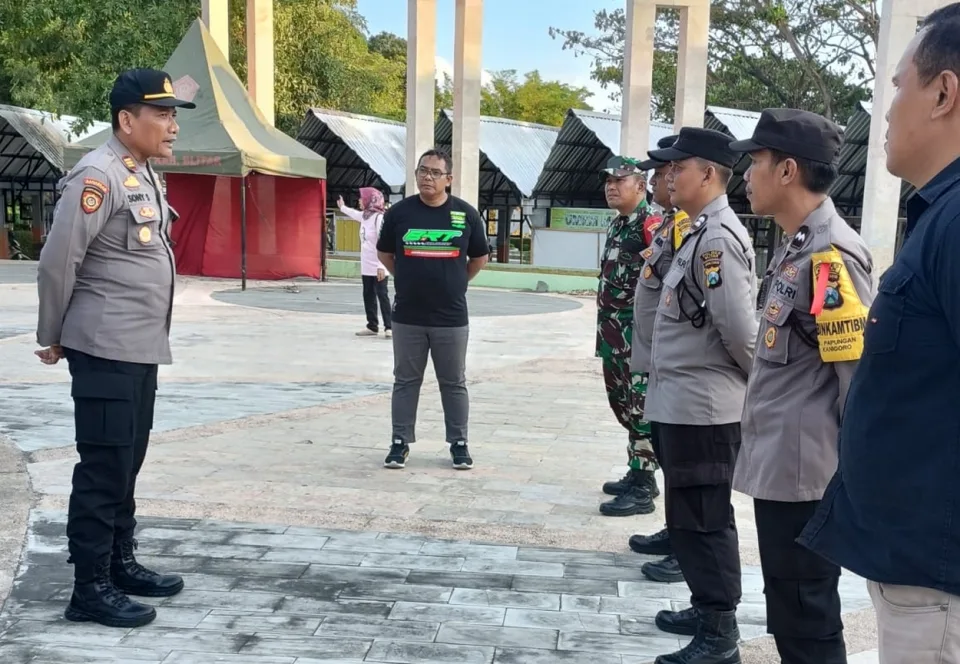 Kapolsek Kanigoro Blitar AKP Sony Suhartanto, memimpin apel pengamanan Pagelaran seni budaya campur Sari dan Bazar UMKM bersama TNI-Polri di halaman depan Taman Terbuka Hijau (RTH) Kanigoro, yang diselenggarakan oleh Pemerintahan Kelurahan Kanigoro Kabupaten Blitar, Jum’at (6/9/2024).