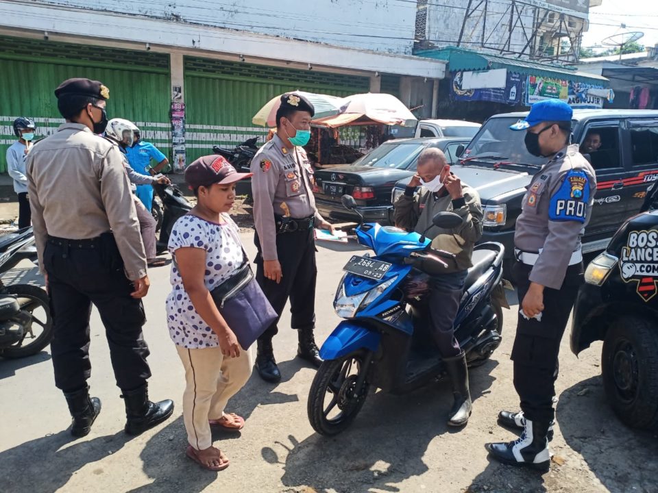 Kapolsek AKP Asib SH MH bersama sejumlah anggotanya melakukan sosialisasi dan bagi bagi masker di jalan raya depan pasar kepada masyarakat penguna jalan yang sedang berbelanja di pasar.