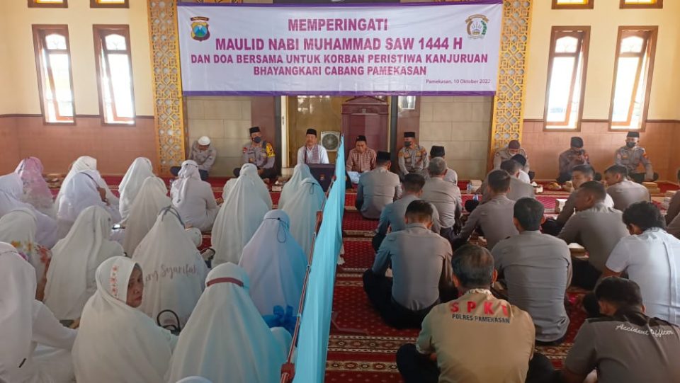 PAMEKASAN, IndonesiaPos – Keluarga besar Polres Pamekasan bersama Bhayangkari, mengikuti acara Maulid Nabi Muhammad SAW, zikir dan doa bersama untuk para korban tragedi Kanjuruhan, Malang, Jawa Timur pada pekan lalu yang menewaskan ratusan suporter Aremania. di Masjid Baitul Amin Polres Pamekasan, Senin (10/10/2022).