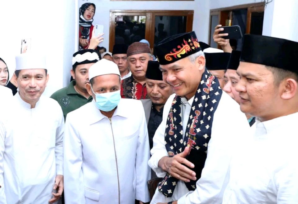 Ganjar yang mengenakan baju koko putih lengkap dengan kopiah hitam langsung dijamu hangat oleh Abuya KH Tubagus Ahmad.