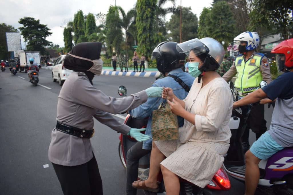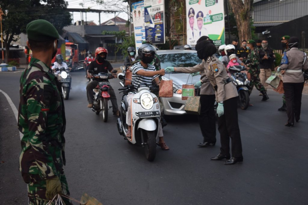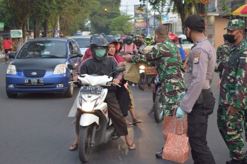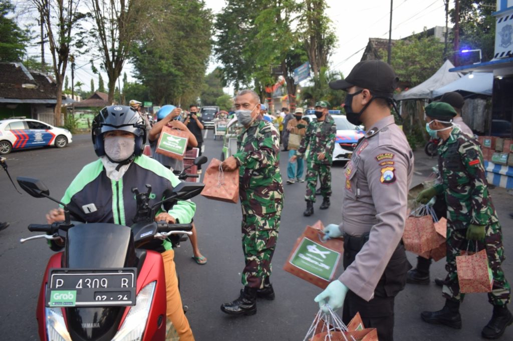 Sejumlah personil TNI dan Polri di Bondowoso membagikan sekitar 300 takjil gratis pada para pengguna jalan yang melintas di seputaran kawasan bundaran Nangkaan, Senin (4/5/2020).