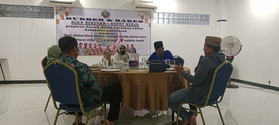 Komunitas Ikatan Wartawan Online (IWO) Perwakilan Daerah Pamekasan meggelar rapat kerja (Raker) dan buka bersama di Hotel Odaita Pamekasan, Madura, Jawa Timur. Kamis, (28/3/2024) sore