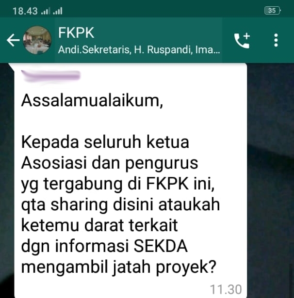 Kepada seluruh ketua Asosiasi dan pengurus yang tergabung di FKPK ini, qta sharing disini ataukan ketemu darat terkait dgn informasi SEKDA mengambil jatah proyek?,”tuilsnya lagi.