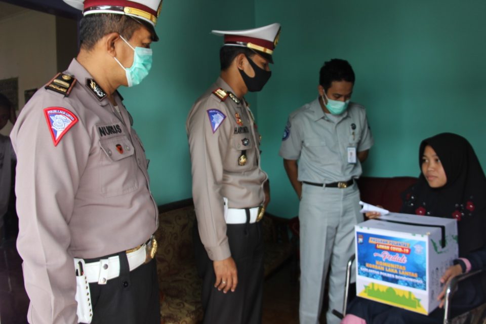 Sebanyak lima korban kecelakaan lalu lintas di Bondowoso mendapatkan bantuan paket sembako, uang tunai, hand sanitizer, serta masker dari Satlantas Polres wilayah setempat. Bantuan diserahkan langsung ke rumah masing-masing penerima.