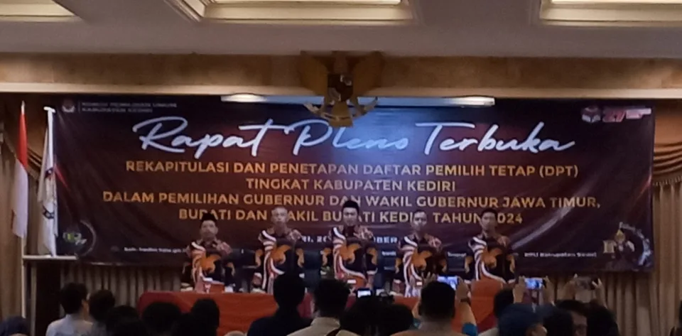 Komisi Pemilihan Umum ( KPU ) Kabupaten Kediri menggelar rapat pleno terbuka untuk melakukan rekapitulasi dan penetapan DPT pemilihan Gubernur dan Wakil Gubernur Jawa Timur juga Bupati dan Wakil Bupati Kediri 2024 yang di Hotel Lotus Jalan Jaksa Agung Suprapto Mojoroto Kota Kediri, Jawa Timur, Jumat (20/9/2024) pukul 11.00 WIB