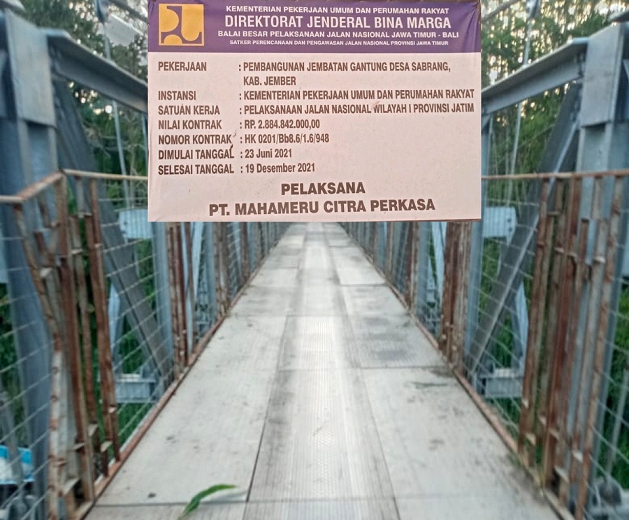 JEMBER, IndonesiaPos – Proyek pebangunan Jembatan Gantung di desa Sabrang, kecamatan Ambulu milik Kementerian Pekerjaan Umum dan Perumahan Rakyat menjadi perbincangan masyarakat sekitar, pasalnya belum genap 1 tahun dibangun, kini sudah mulai rusak.