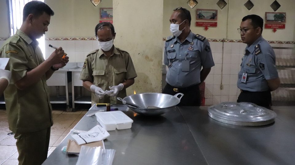 Uji laboratorium makanan secara berkala dilakukan oleh petugas dari Labkesda Dinas Kesehatan Kediri disaksikan Plt Kepala Lapas Kediri, Budi Ruswanto, Kasi Binadik Harry Poespo, Kasubsibimkemaswat Dena Anggika dan Dokter Lapas Christanti.