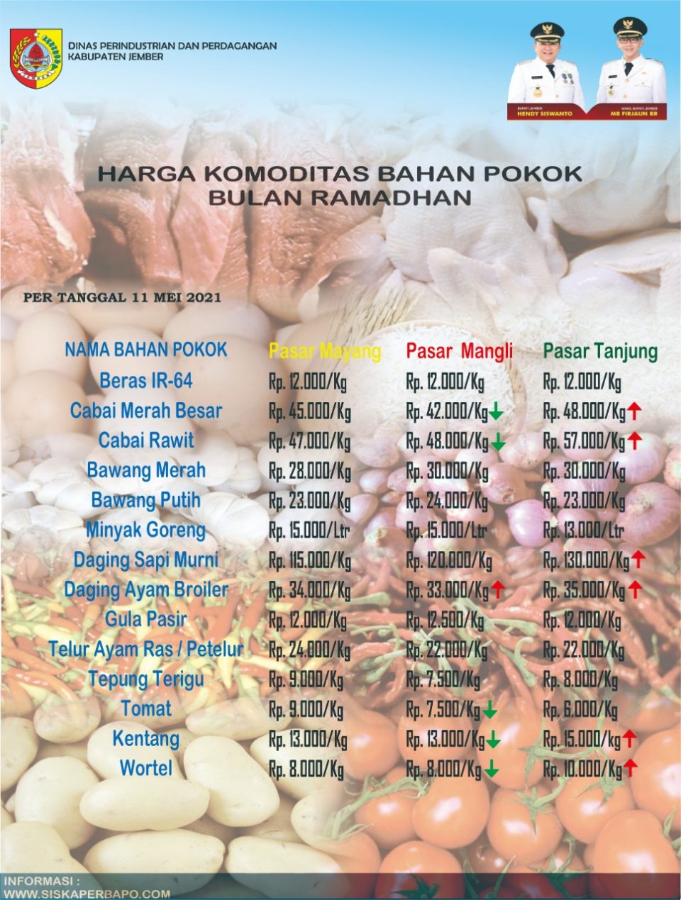 Kenaikan harga barang disejumlah pasar di Jember terpantau wajar. Dari data sementara yang berhasil dihimpun media yang dikeluarkan dinas perindustrian dan perdagangan (disperindag)kabupaten Jember terlihat kenaikan harga barang terjadi pada beberapa  jenis  barang diantaranya cabai besar merah dan cabai rawit terjadi kenaikan di pasar Tanjung Jember dengan harga tertinggi Rp.48 0000/ kg untuk cabai besar sedangkan cabai rawit Rp.57.000/kg.