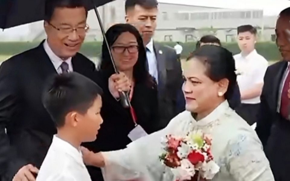 Presiden dan Ibu Negara langsung disambut oleh dua orang anak, satu perempuan dan satu laki-laki membawa bunga tangan yang langsung diberikan ke Iriana dan Jokowi.