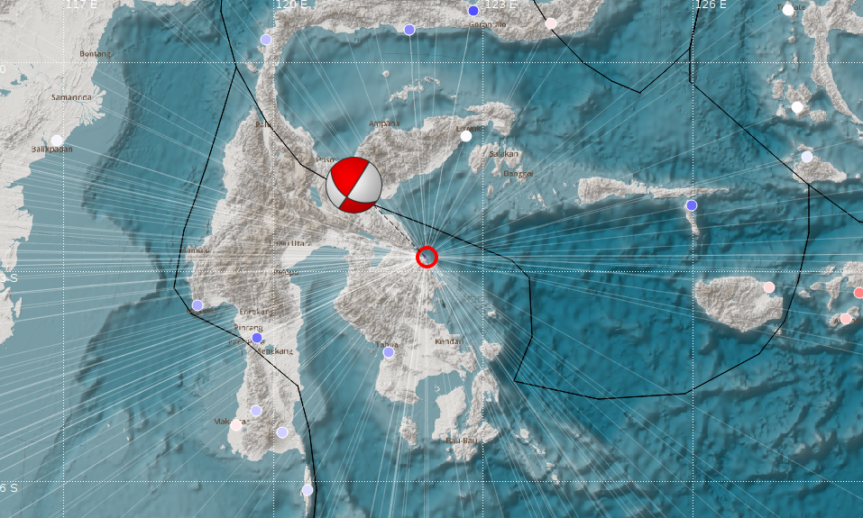Pusat gempa berada pada koordinat 2,57 derajat LS, dan 121,87 BT. Unggahan BMKG tersebut belum menginformasikan tentang wilayah mana saja yang merasakan getaran gempa.
