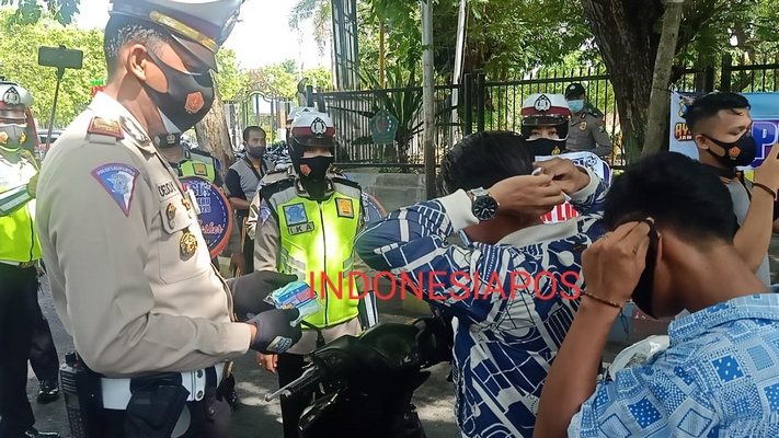Petugas yang menemukan pengendara tidak menggunakan masker, langsung ditegur dan diberikan masker oleh petugas Satlantas Polres Pamekasan., dan mengajak masyarakat untuk tetap mentaati dan melaksanakan 3 M.
