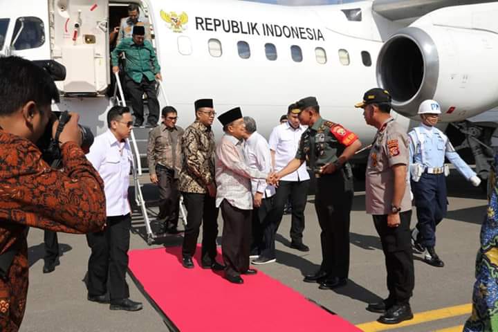 Pangdam IX/Udayana Mayjen TNI Benny Susianto, S.IP., bersama Gubernur NTB Dr. H. Zulkieflimanyah, SE. M.Sc., menyambut kedatangan Wakil Presiden RI Jusuf Kalla dan rombongan di Bandara Sultan Muhammad Kaharudin III jalan Garuda Sumbawa dalam, Sabtu (3/8).