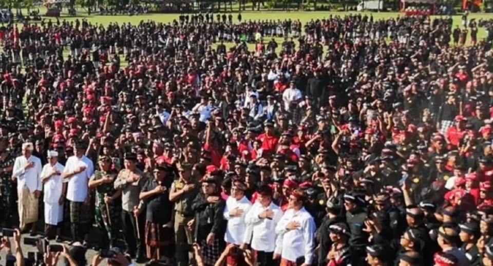 Belasan ribu anggota pecalang yang didatangkan dari 1.500 desa adat dari sembilan kabupaten dan kota di Bali berkumpul di Lapangan Niti Mandala Renon Denpasar, Senin (1/9/2025).