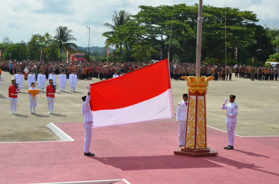 Peringatan Detik detik Proklamasi dalam rangka HUT ke-80 Kemerdekaan Indonesia di Peringati di Kutai Barat, pada jam 10.00 WITA, Bendera Mera Putih dikibarkan di Alun alun Itho Komplex Kantor Bupati Kubar, Minggu ( 17/8/2025 )