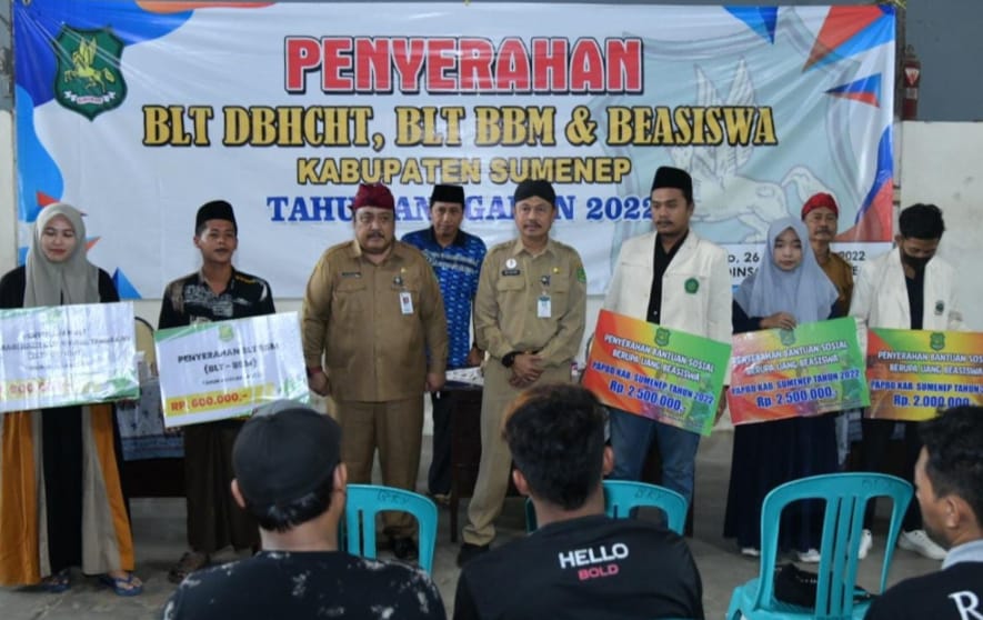 SUMENEP, IndonesiaPos – Pemerintah Kabupaten (Pemkab) Sumenep, menyerahkan Bantuan Sosial (Bansos) Bantuan Langsung Tunai (BLT) Dana Bagi Hasil Cukai Hasil Tembakau (DBHCHT) BLT BBM, dan Beasiswa 2022 kepada masyarakat.