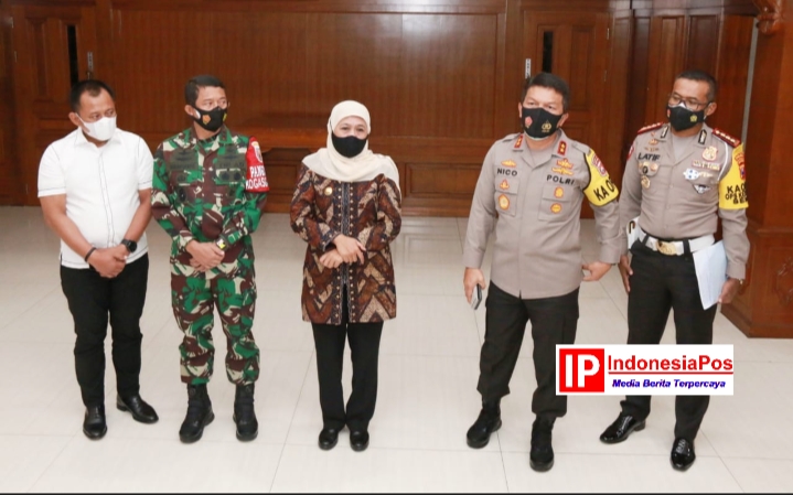 Gubernur Jawa Timur Khofifah Indar Parawansa, Pangdam V Brawijaya Mayor Jenderal TNI Suharyanto, dan Kapolda Jawa Timur Irjen Pol Nico Afinta, melakukan rapat koordinasi dengan Panglima TNI dan Kapolri, dan beberapa Mentri secara Virtual di gedung Rupatama Mapolda Jatim, Rabu (21/4/2021).