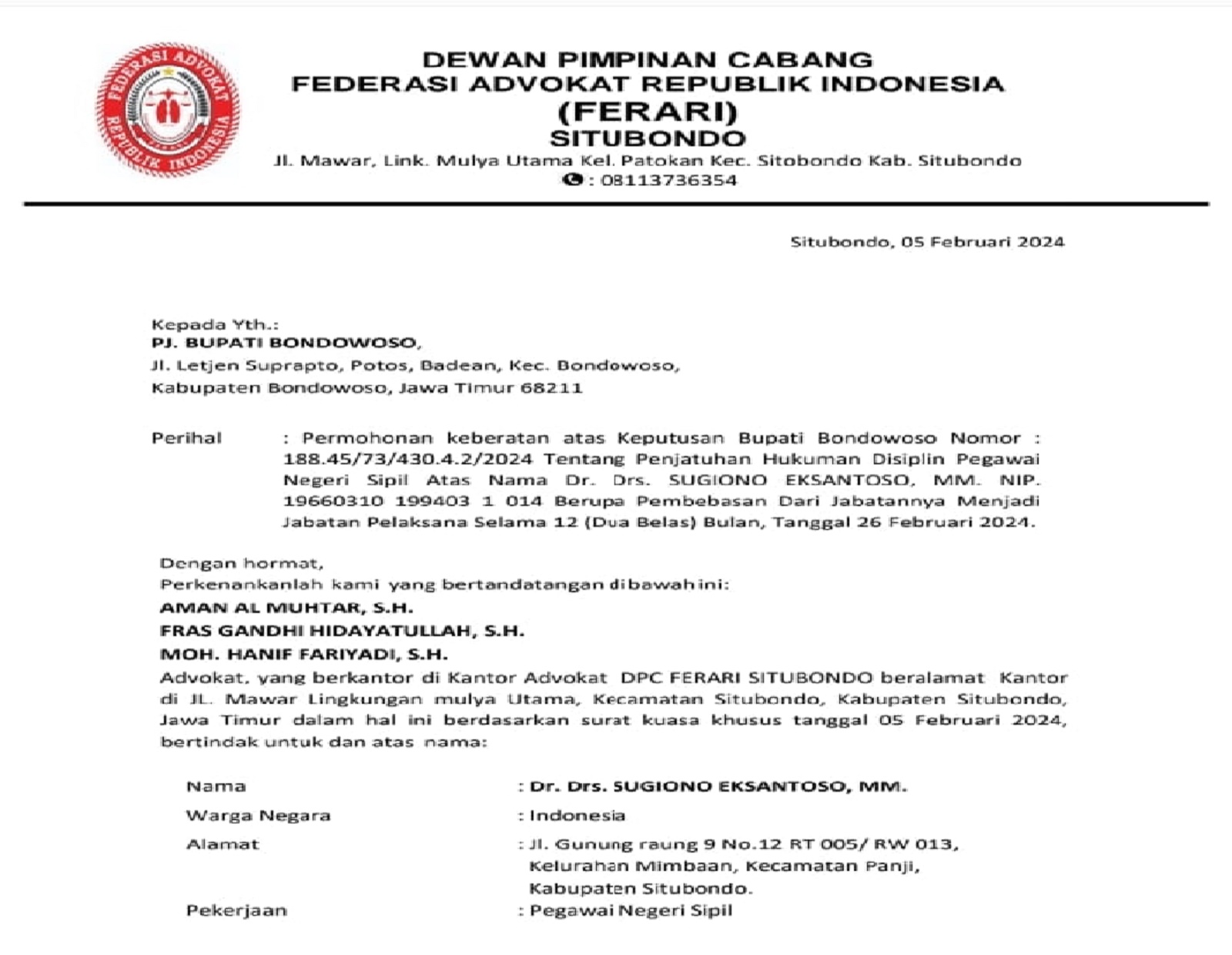 Sugiono Eksantoso melalui kuasa hukumnya Aman Al Muhtar melayangkan surat keberatan kepada Pj Bupati Bambang Soekwanto, terkait penjatuhan hukuman disiplin Pegawai Negeri Sipil (PNS).Rabu (7/2/2024).