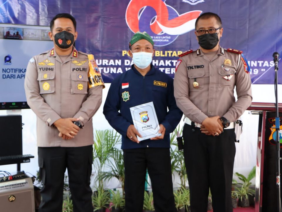 Polres Blitar Kota menggelar tasyakuran dan berbagi bingkisan dan memberikan vaksin kepada 50 orang tuna wisma dalam rangka Hari Lalu Lintas Bhayangkara ke-66.