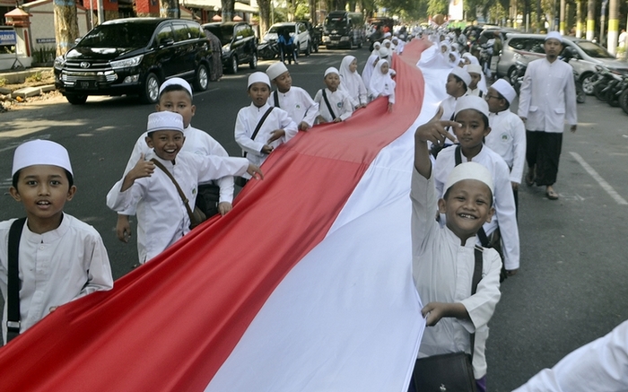 Peringatan Hari Santri Nasional (HSN) 2019, disambut suka cita siswa-siswi Madrasah Ibtidaiyah (MI) At Taqwa Bondowoso Jawa Timur (Jatim). Mereka turun ke jalan melakukan pawai sambil membentangkan bendera merah putih sepanjang 205 meter pada Selasa pagi (22/10/2019). Selain itu, membawa bedug dan berbagai poster sebagai wujud suka cita merayakan HSN 2019.