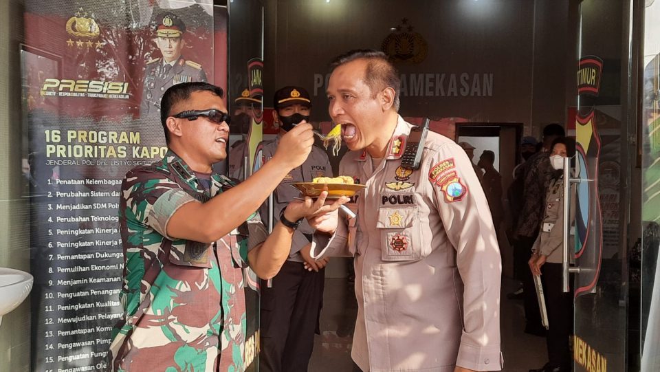 PAMEKASAN, IndonesiaPos – Hari ualnag tahun Bhayangkara Ke-76, Dandim 0826 Pamekasan Letkol Inf Ubaydillah memberikan kejutan kepada Polres Pamekasan dengan memberi nasi tumpeng dan kue ulang tahun kepada Kapolres Pamekasan di Mapolres Pamekasan, pada Jum’at (01/07/2022).