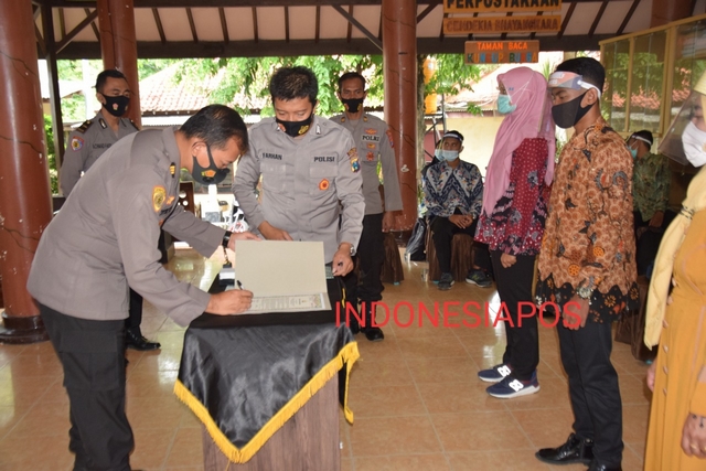 Peserta calon bintara Polri menandatanganan fakta integritas dan pengambilan sumpah rekrutmen Polri proaktif tahun 2021, di gedung Joglo Joko Tarup Polres Pamekasan. Yang dilakukan secara virtual.Kamis ( 10/12/2020) pagi.