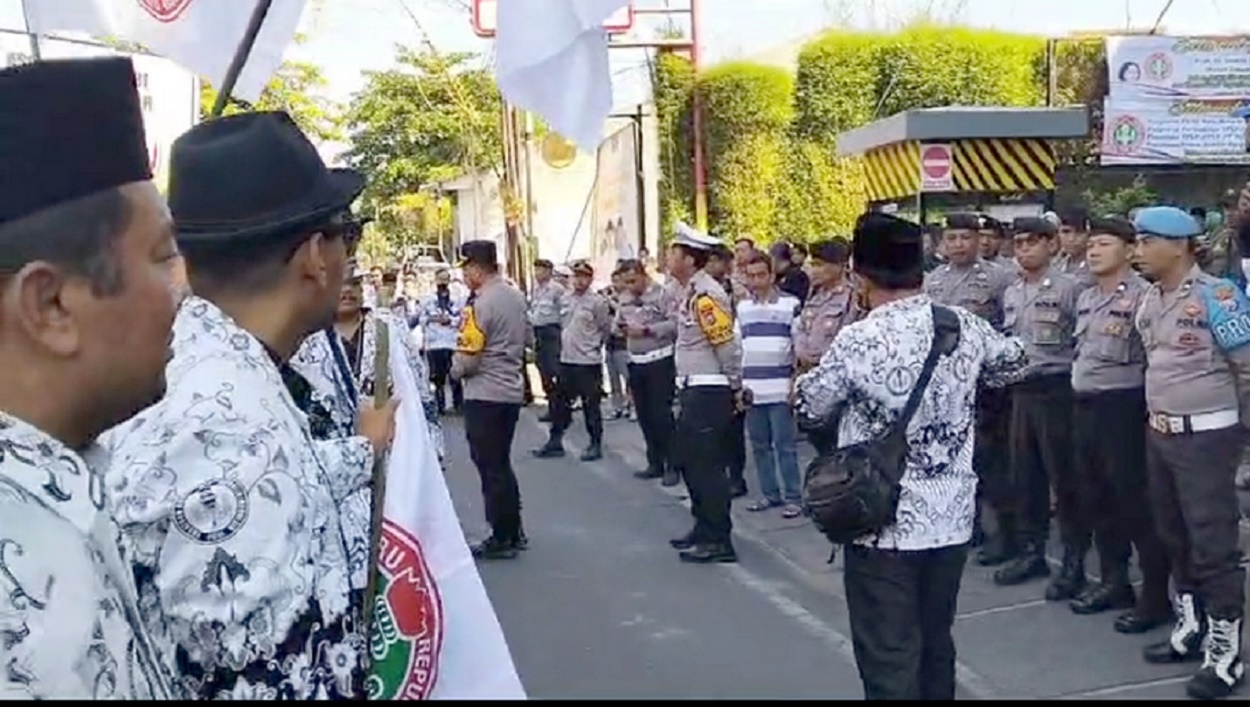 Ribuan anggota Persatuan Guru Republik Indonesia (PGRI) Jember melakukan aksi demo turun ke Jalan pada Minggu (5/5/2024).