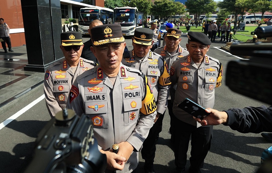 Kapolda Jawa Timur Irjen Pol Drs Imam Sugianto, saat usai memimpin Apel Gelar Pasukan dalam rangka pemberangkatan personel di Lapangan Polda Jatim.