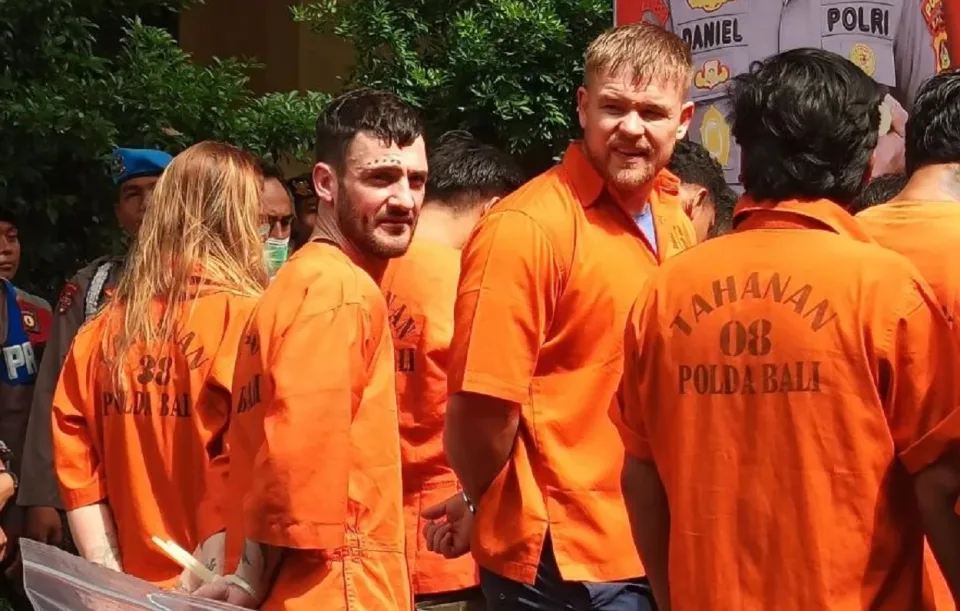 Saat dihadirkan dalam konferensi pers di Mapolda Bali, Jumat, ketiga WNA Inggris itu diborgol bersama dengan puluhan tahanan lainnya.