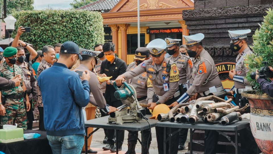 Ribuan botol miras dimusnahkan dengan cara digilas menggunakan alat berat. Sedang pemusnahan knalpot brong dilakukan dengan cara dipotong menggunakan gerinda.