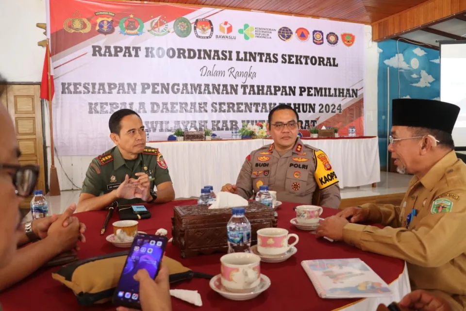 Rakor lintas sektoral dihadiri oleh Drs. Rakhmat, M.Si Asisten II Kubar, Kapolres AKBP Kade Budiyarta, S.I.K, Dandim 0912 Letkol Czi Eko Handoyo, S.T, Ketua KPU Rintar Pasaribu, S.H, Kabag Ops Kompol E. Teguh Budi S. S.Th, Pasi Ops Kodim 0912 Kapten Inf. Hariyadi, Danki Brimob, Iptu Umar Riyadi, S.H