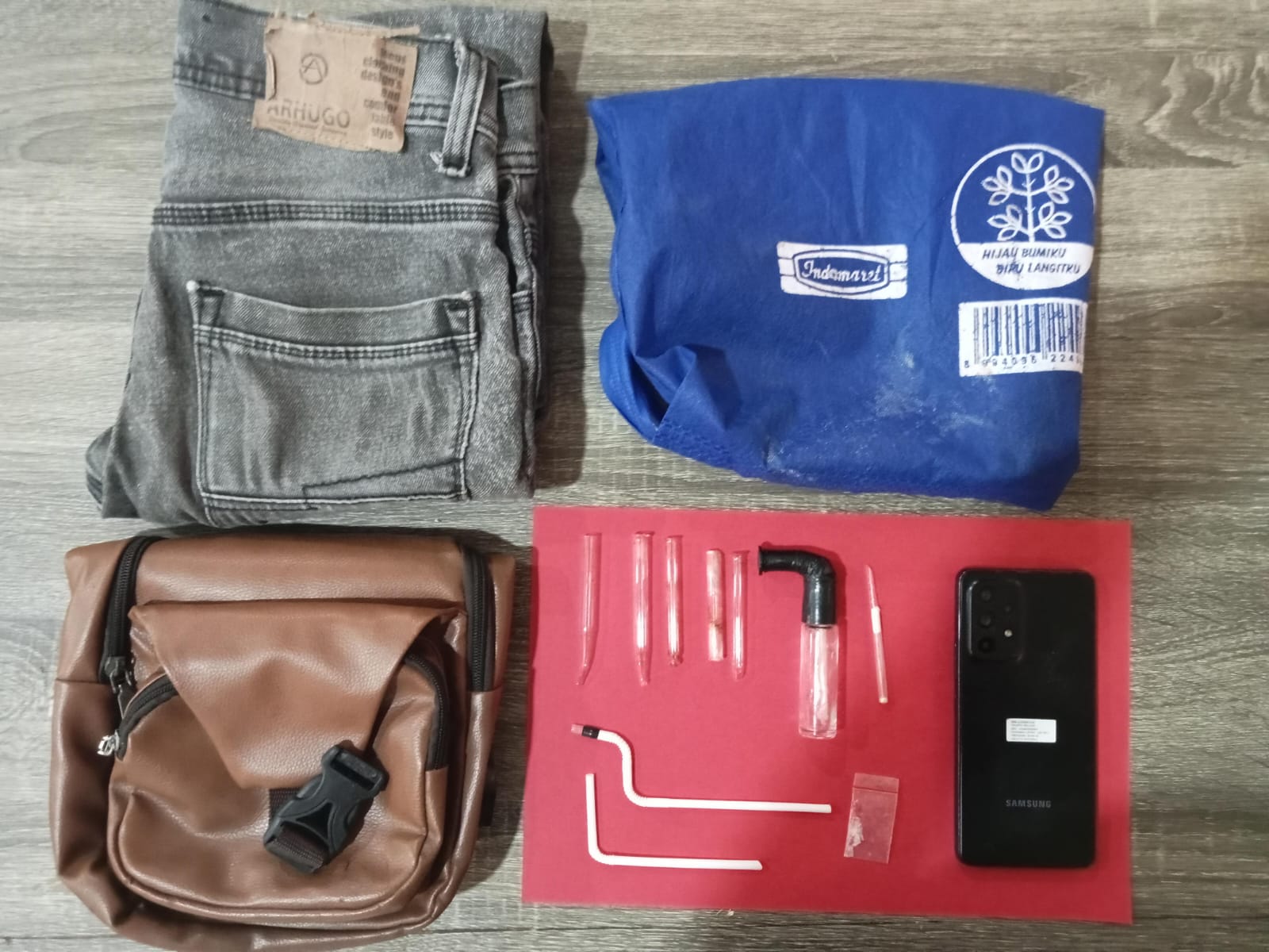 Pada saat dilakukan penangkapan, petugas melakukan penggeledahan terhadap pelaku. Saat itu pula polisi berhasil menemukan barang bukti dan berhasil diamankan berupa 1 poket narkotika jenis sabu-sabu dengan berat kotor 0,3 Gram, barang-barang penggunaan narkotika, dan barang bukti lainnya,
