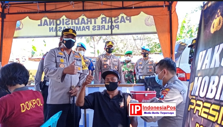 Pada kesempatan tersebut Kapolres Pamekasan AKBP Apip Ginanjar, bersama PJU Polres Pamekasan tinjau langsung giat Vaksinasi Mobile Presisi di Pasar Kolpajung yang dilakukan oleh Urkes Polres Pamekasan. ( andi )