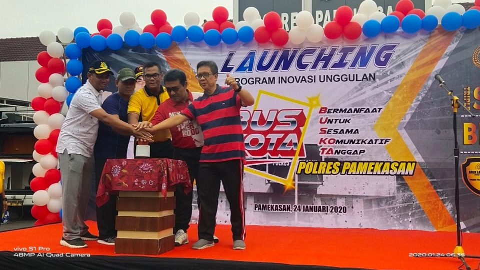 Polres Pamekasan melaunching program Inovasi unggulan BUS KOTA.program tersebut untuk mempermudah pelayanan masyarakat di wilayah Hukum Polres Pamekasan. Jum’at (24/01/2020). pukul 07.00 WIB. di halaman depan Mapolres Pamekasan.