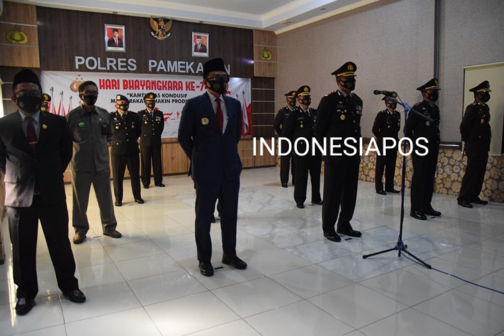 PAMEKASAN,IndonesiaPos – Peringatan Hari Bhayangkara yang ke-74 tahun ini diperingati dengan cara yang berbeda dari tahun yang sebelum nya, karena pandemi Covid-19. Yang dihadiri Kapolres Pamekasan AKBP Djoko Lestari, Forkopimda, PJU Polres, Perwakilan Kapolsek jajaran Polres Pamekasan.