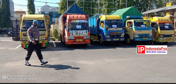 Kepolisian Resor Pamekasan terjunkan 6 unit truk menuju Buduran Sidoarjo untuk menjemput 52 ton bantuan Presiden melalui Kementerian Investasi (Kemenves) di Buduran Kabupaten Sidoarjo, Jawa timur. Senin 19 Juli 2021.