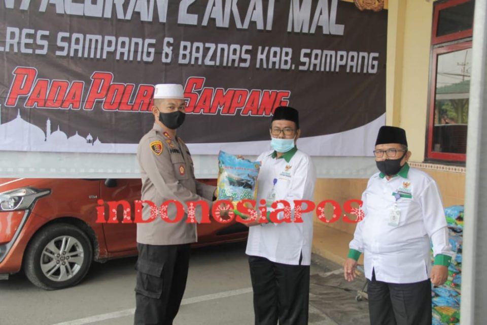 Kapolres Sampang AKBP Abdul Hafidz serahkan 745 sak beras kepada Ketua Baznas Kabupaten Sampang KH. Moh. Faidhol Mubarak pada apel penyaluran infaq dan shodaqoh anggota Polres Sampang di lobby Mapolres Sampang, Selasa (24/11/2020).