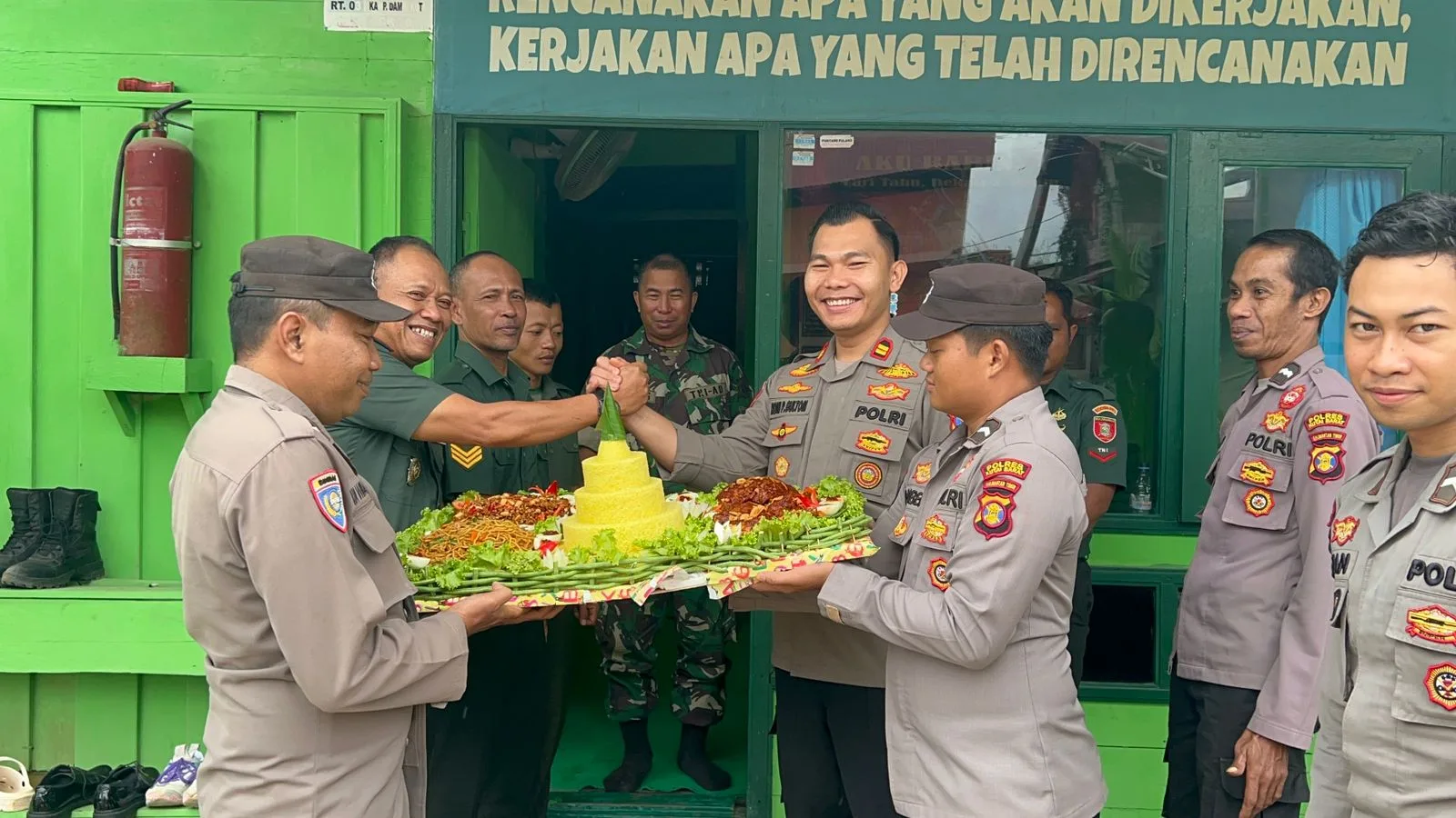 Setelah penyerahan simbolis, acara dilanjutkan dengan pemotongan tumpeng oleh Kapolsek Damai dan diserahkan kepada Danramil Damai sebagai wujud kebersamaan serta penghargaan atas dedikasi TNI dalam menjaga kedaulatan dan keamanan negara.