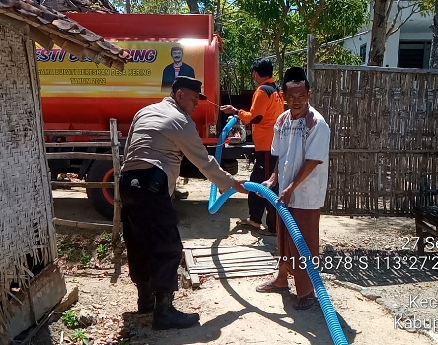 Polsek Tlanakan mengawal program Bupati Bersama Bupati Bereskan Desa Kering, mendistribusikan air bersih di beberapa desa yang mengalami kekeringan.