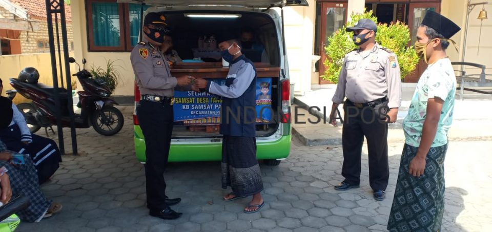 PAMEKASAN,IndonesiaPos – Himbauan Kamtibmas terkait tertib berlalu lintas yang diberikan kepada warga masyarakat yang sedang dalam antrian menunggu pembayaran Pajak Samsat Keliling di Kantor Mapolsek Palengaan,pada Selasa (04/8/2020).
