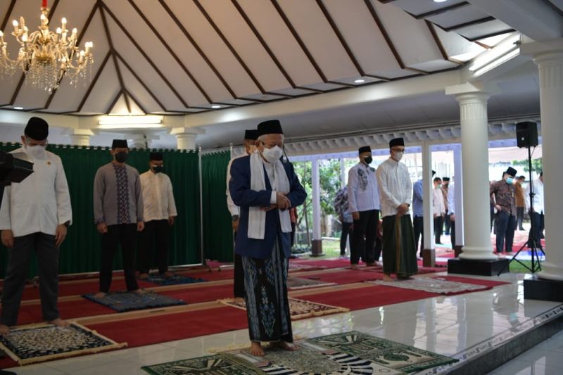 Sementara itu, Wakil Presiden RI KH. Ma’ruf Amin melaksanakan salat Idul Adha 1442 Hijriyah di kediamannya secara terbatas, Selasa (20/7/2021).