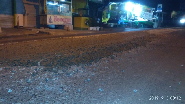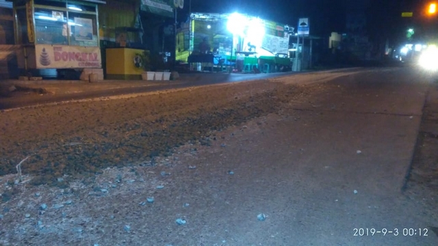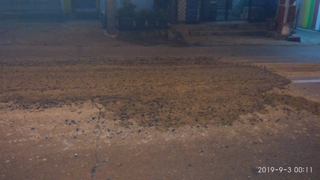 “Mulai dari gapura utama sampai ke arah pos jaga gapura kedua, material betonnya tumpah dan berserakan di sepanjang jalan. Hal itu tentu saja sangat membahayakan pengguna jalan. Kalau sampai ada yang jatuh gara-gara tumpahan material itu, siapa yang akan bertanggung jawab ?”, ujar Makmur, salah seorang warga yang sedang melintas, Selasa (3/9/2019) dinihari.