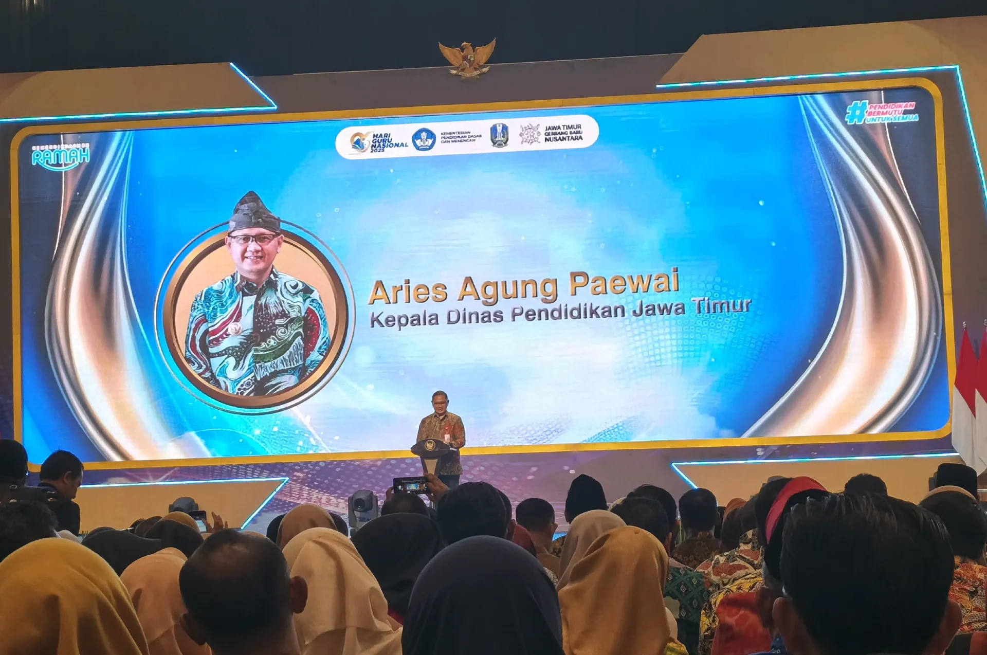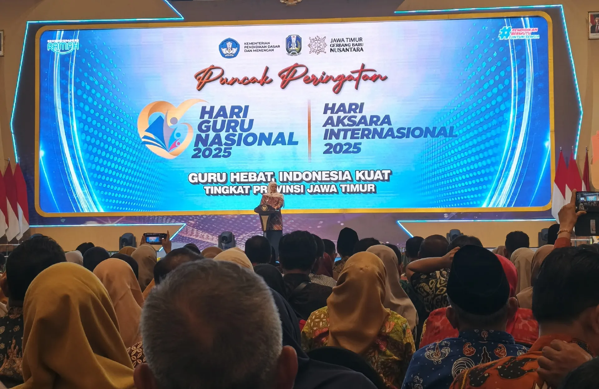 Ballroom Hotel Grand City Surabaya berubah menjadi lautan penghormatan dan selebrasi pada 1 Desember 2025, ketika ribuan pendidik dari seluruh penjuru Jawa Timur berkumpul untuk merayakan puncak Hari Guru Nasional yang dirangkaikan dengan Hari Aksara Internasional.
