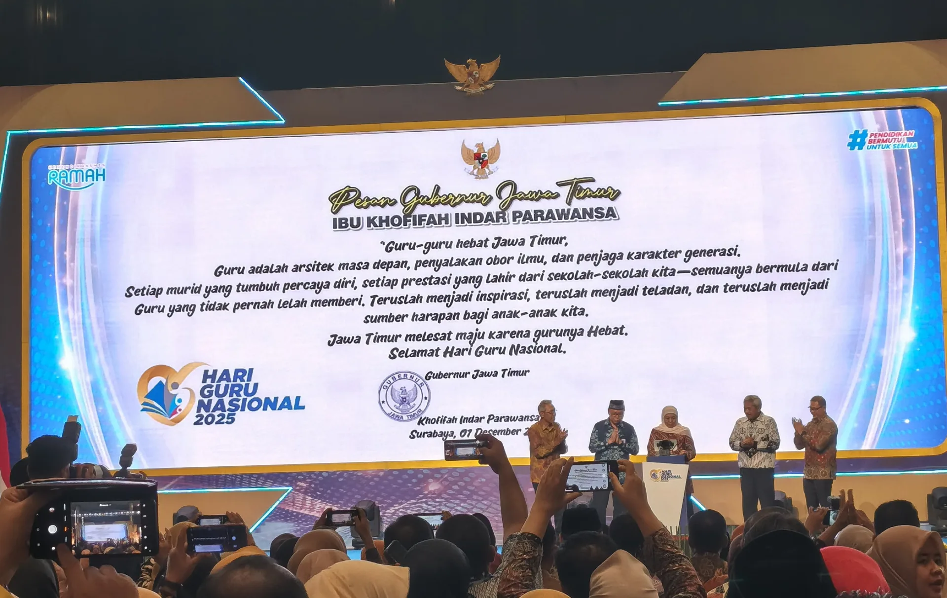 Rangkaian acara puncak Hari Guru Nasional dan Hari Aksara Internasional 2025 di Surabaya ditutup dengan seruan bagi seluruh pemangku pendidikan untuk terus menegakkan komitmen terhadap literasi, kreativitas, dan inovasi.