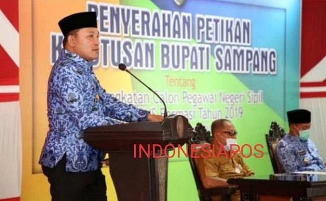 Bupati Sampang Slamet Junaidi, menyerahkan Petikan Surat Keputusan (SK) kepada ratusan Calon Pegawai Negeri Sipil (CPNS) Formasi Tahun 2019. di Pendopo Sampang. Senin (04/01/2021).