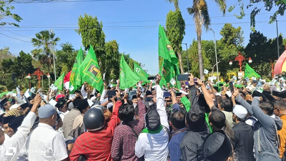Ribuan Muhibbin dan pendukung berbondong-bondong mengiring Pasangan Calon (Paslon) Kiai Ali Fikri -Kiai Unais Ali Hisyam (FINAL) mendaftar ke Kantor Komisi Pemilihan Umum (KPU) Sumenep.