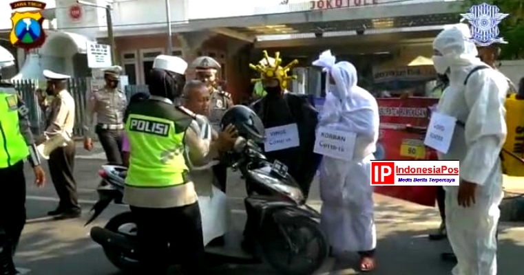 Dalam rangka menekan penyebaran covid-19, Satlantas polres Pamekasan menggelar kampanye teaterikal pocong korban Covid-19 di Simpang Pos 1, di Jalan Jokotole, Pamekasan. Sabtu (22/5/2021).