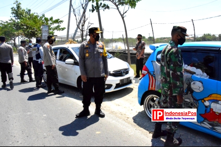 Personil Polres Pamekasan bersama instansi terkait melakukan penyekatan dan memberhentikan kendaraan dengan nomor plat luar daerah, di jalan Raya Ambat, Kecamatan Tlanakan. Senin, (10/5/2021)